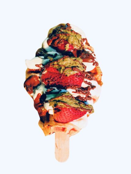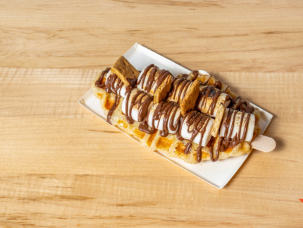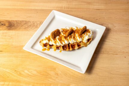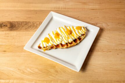 A croissant-waffle hybrid topped with a generous layer of whipped cream.
